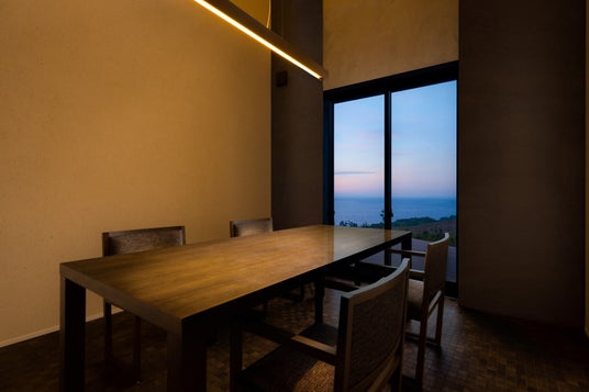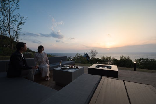 戸田港を優美に包む白砂青松の御浜岬。その高台に佇む「富士青藍」は、孤高の富士山と深い青を湛える駿河湾という、ここにしかない眺望を独占するスモールラグジュアリーホテルです。富士山と海、そして夕陽という三位 一体の絶景こそが、富士青藍が誇る最高のおもてなしです。客室はもちろん、夕日を愛でるためだけに設えた夕 陽見テラスからは、刻一刻と変化する空と海の色彩のグラデーションをお楽しみいただけるなど、ホテル内で過ごすどの瞬間にも絶景をお楽しみいただけます。夕陽見テラスでは、お酒やコーヒー、軽食を21時30分まで無料で提供しており、夕日が沈んだあとの静かな海を眺めながらゆったりとした時間をお過ごしいただくことも可能です。