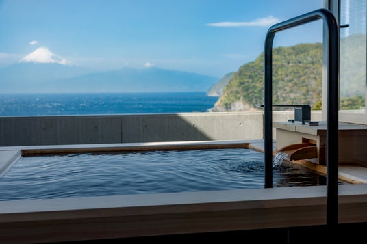 各部屋は、海に面したデッキテラスや、駿河湾と富士山を一望できる露天風呂、前面すべてがガラス仕様となった富士青藍専用の特別な屋外サウナを備えており、雄大な自然が織りなす絶景を贅沢に味わうことができます。