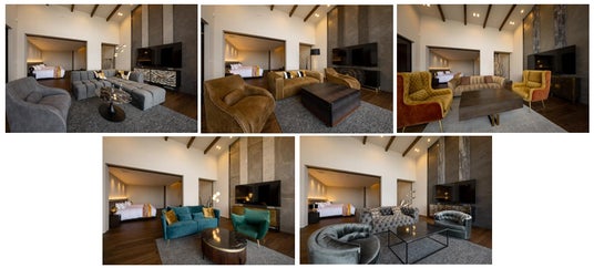 【蒼天(SOUTEN):画像上段左】 柔らかで落ち着いた蒼の色と鳥の視線の様に広がる空をイメージしたお部屋です。他のお部屋にはない大型のL字型ソファでお寛ぎください。