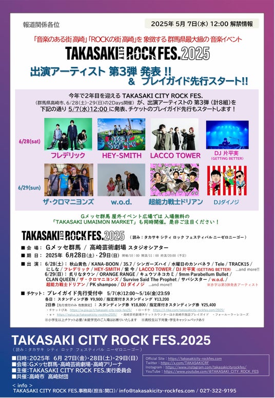 【TAKASAKI CITY ROCK FES.2025】出演アーティスト第3弾発表!!&プレイガイド先行スタート!!