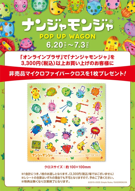 「オンラインプラザ」で「ナンジャモンジャ」製品を3,300円(税込)以上お買い上げのお客様に、「非売品マイクロファイバークロス」を1枚プレゼントいたします。