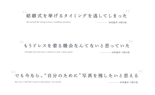 結婚式を挙げるという選択ができなかった方々の中から、「もう一度、写真というかたちで“想い”を残したい」そんな気持ちが、少しずつ届くようになりました。
