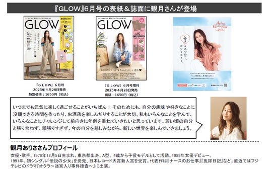 ファッション雑誌販売部数トップシェア(※)の株式会社宝島社(本社:東京都千代田区、代表取締役社長:関川誠)が発行する女性ファッション雑誌『GLOW(グロー)』と、株式会社朝日新聞社(本社:東京都中央区、代表取締役社長:角田克)による共同事業、「Aging Gracefully(エイジンググレイスフリー) プロジェクト」がこの春8年目を迎えました。プロジェクトアンバサダーには観月ありささんが初の3年連続就任。4月28日(月)発売の『GLOW』6月号に登場いただき、これまでの活動や3年目の意気込みについてお話を聞きました。
