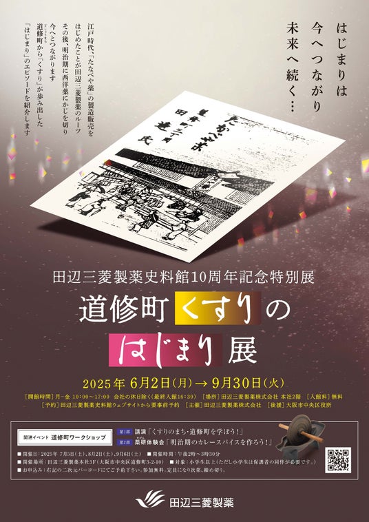 田辺三菱製薬株式会社(本社:大阪市中央区、代表取締役社長:辻村明広、以下「田辺三菱製薬」)は、6月2日(月)から、田辺三菱製薬史料館(以下「史料館」)において、開館10周年記念特別展「道修町くすりのはじまり展」と関連イベントを開催します。