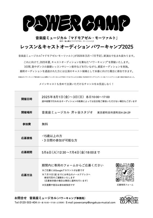また、2025年8月にはこの公演に向けてのオーディションも兼ねたパワーキャンプも開催し、主要キャストを含めた新しい出会いの場を設けます。