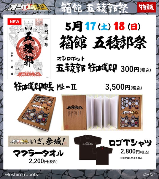 物販内容:オシロボット五稜郭御城印・・・300円(税込)、ロゴTシャツ・・・2,800円(税込)