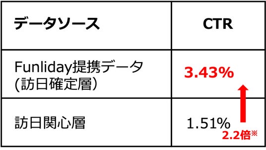 台湾最大手の旅行計画アプリ会社Funliday,Inc.(本社:台北市中山区、CEO:黄 韋力、以下Funliday)との提携により、「実際に訪日が確定している旅行者」という今まで以上にピンポイントなターゲティング広告配信が可能になりました。トライアルの配信では既存の「訪日関心層」セグメントと比較して、2.2倍のCTR※を記録し、ターゲティングの効果も示されました。
