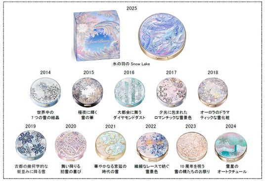誕生12年目を迎える2025年のテーマは、「氷の羽のSnow Lake」。夜明け前、澄んだ水面の湖に白鳥が訪れ、まるでワルツを踊るかのごとく通り過ぎた後、繊細な羽の彫刻のように美しく氷ついた湖面が表現されています。大人っぽさとときめき溢れるコンセプト・デザインを、スノービューティーファンである愛用者の皆さまと選定しました。