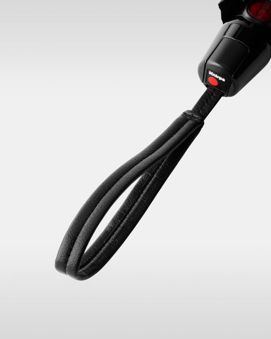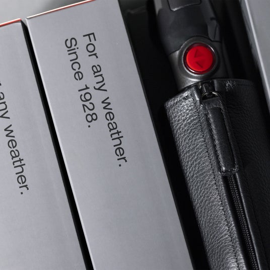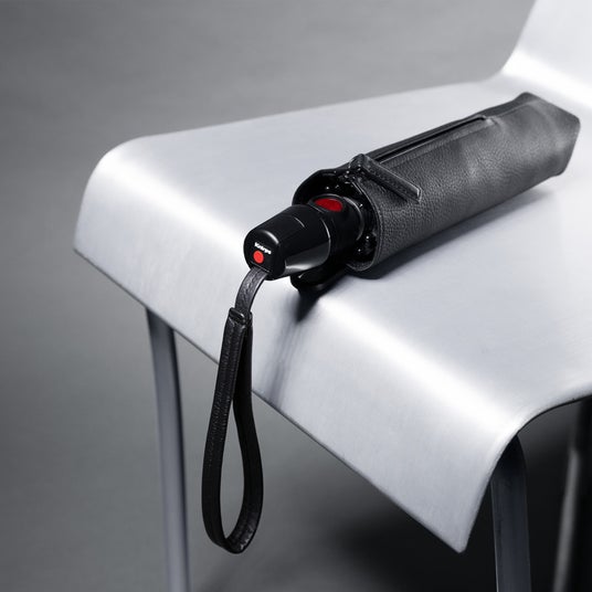ナイロン製のストラップ部分を、しっとりと手に馴染む柔らかな質感の防水レザー仕様にアップグレード。また、グリップ部分は従来のグレーから、艶やかなブラックにカスタマイズ。傘の内側にはKnirpsの象徴である赤いドットを配したロゴを採用し、さりげなく存在感のあるデザインに。T.220シリーズならではのミニマルな外観を踏襲しつつ、objcts.ioならではのアレンジを加えたモデルに仕立てました。