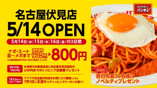5月14日(水)名古屋伏見店の新規開店を記念し3つのオープニングキャンペーンを開催します。キャンペーン第一弾はオープン3日間・5月16日(金)までナポリタンおよびミートソースを180円割引でご提供。第二弾は5月24日(土)までトッピング定期券(1回1品/240円商品まで・有効期間6月末)をもれなく全員に進呈します。さらに第三弾はパンチョ公式アプリで名古屋伏見店をお気に入り登録の方に7月1日(火)にトッピング「王道セット」クーポンを配信します。