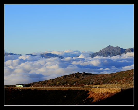乗鞍スカイライン 乗鞍岳へ続く「乗鞍スカイライン」は、標高2,702mの畳平まで、バスまたはタクシーで上がることができる日本一標高の高い場所を走ることができる全長14.4kmの山岳観光道路です。また、自転車での走行もできるため、サイクリストにも人気のルートになっています。