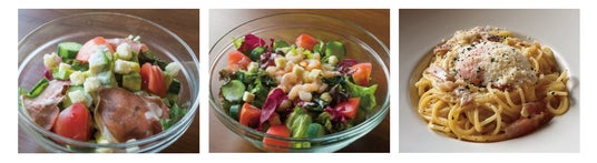 生ハムとアボカドのサラダ 小えびと海藻のサラダ 温泉玉子のカルボナーラ
