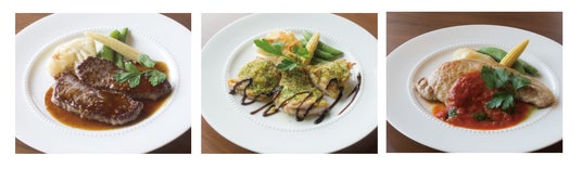 牛肉のステーキ ガーリックソース チキンの香草パン粉焼きバルサミコソース ポークソテートマトソース