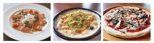 スモークサーモンのカルパッチョ 小えびときの子のドリア ベーコンときの子のピッツア