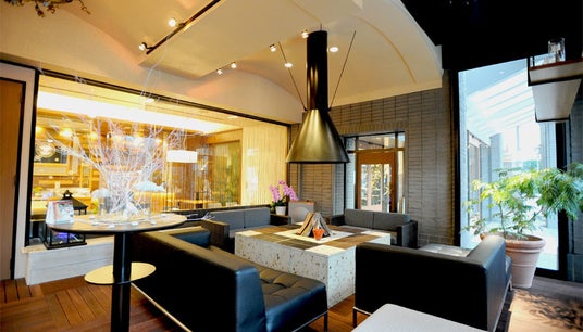 日立市のシビックセンター広場側にある、半屋外のテラス席。暑い日には道を挟んだ向かいの壁に水が流れて人口の小さな滝が流れ涼しさを感じさせてくれ、また、柱のグリーンが気分を和ませ、ステキな会話を引き出します。
