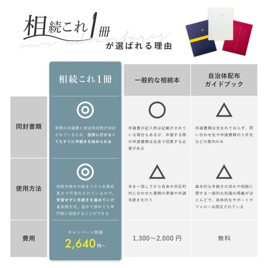 このカードがあるだけで、万一の際にご家族は無料で特許取得済の相続手続きファイル『相続これ1冊(継承ノ綴り)』を取り寄せることができます。