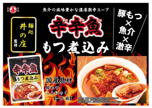 この度、東京にある人気ラーメン店「麺処 井の庄」が監修した、激辛タイプの「麺処井の庄監修 辛辛魚もつ煮込み」を発売します。激辛好きに是非食べてみてもらいたい、辛さだけでなく旨みも特長のもつ煮込みです。魚介の風味豊かな濃厚な味わいで、やみつきになる味を再現しています。