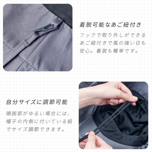 すっぽりかぶって小顔魅せ!ツバ部を下げると11cmのつば広タイプで、顔から首もとまで日差しをガード。ちょっとしたお出かけ時のすっぴん隠しにも。つばを折り返すことで上げ下げできて、視界を自由に調節可能。内側はムレにくいメッシュ生地で快適!フックで取り外し可能なあご紐付。頭囲部がゆるい場合はヒモで調節可能。UVカット率99%以上。手洗いOK。