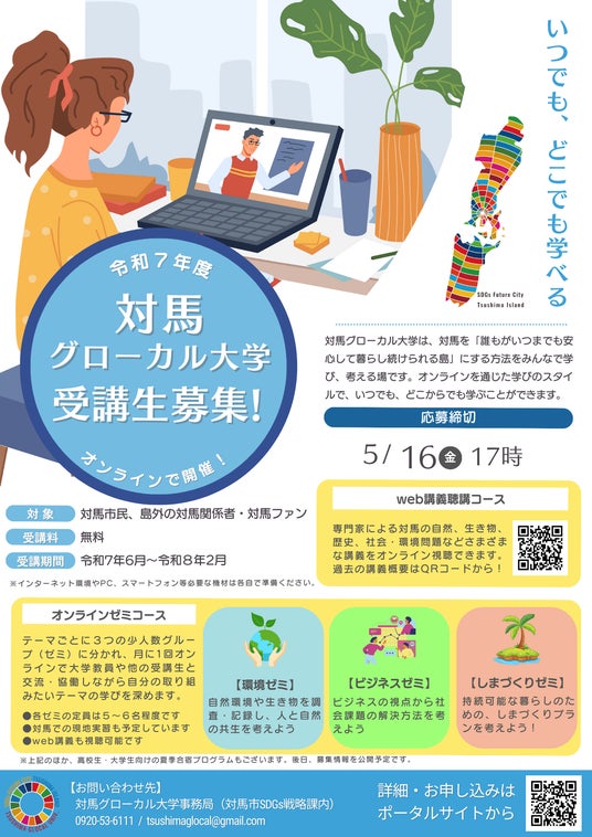 対馬市では、SDGsの推進を担う人づくりの取り組みとして、オンラインを活用した「グローバル×ローカル」な学びのプログラム「対馬グローカル大学」を展開しています。