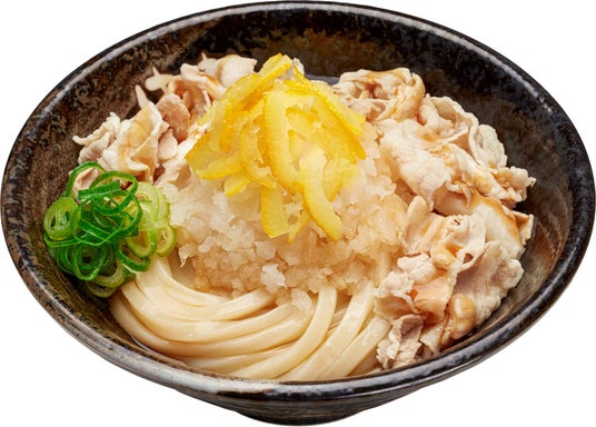 柚子鬼おろしぶっかけ爽やかで香り高い柚子を、鬼おろしにトッピングして、ポン酢で仕上げています。表面はソフトで中心部は弾力が強い、コシのある讃岐うどんやつけだしとの相性もよく、さっぱりしていて箸が進みます。柚子の黄色が彩りよく、見た目よし、味よしの清涼感あふれる一杯です。