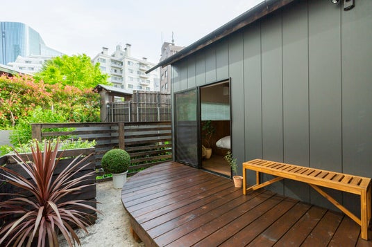 3室ある客室はそれぞれ印象を変えており、どの部屋に寝ようかと迷うのも一つの楽しみに。小さな庭エリアは、敷地面積が限られる中でも光や憩いを得ようとした東京都心部ならではの設計。改装時にはウッドデッキを設け、居心地の良さを高めました。マンションが立ち並ぶ現在ではなかなか見られなくなった贅沢な住宅空間が、都心にいることを忘れさせてくれます。