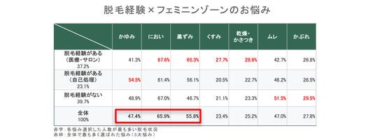 - フェミニンゾーンの悩み 脱毛経験者(医療・サロン)は「黒ずみ」や「くすみ」の悩みを抱えることが多く、フェムケア使用経験が比較的多い傾向にありました。一方、自己処理での脱毛を行っている人は「かゆみ」や「乾燥・かさつき」、脱毛未経験者は「ムレ」や「かぶれ」の悩みが多いことが分かりました。