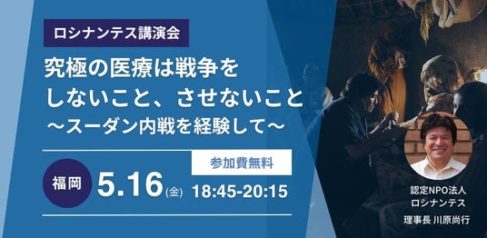 認定NPO法人ロシナンテス(所在地:福岡県北九州市、 理事長:川原尚行)は、長年アフリカ・スーダンに身を置いて活動してきた川原による講演を開催します。
