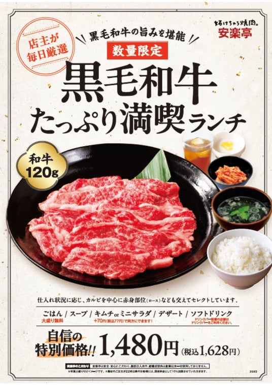 焼肉レストラン「安楽亭」(本社:埼玉県さいたま市)は、これまで一部店舗にて販売していた人気商品「黒毛和牛たっぷり満喫ランチ」を、2025年5月8日(木)より、72店舗へ販売拡大いたします。