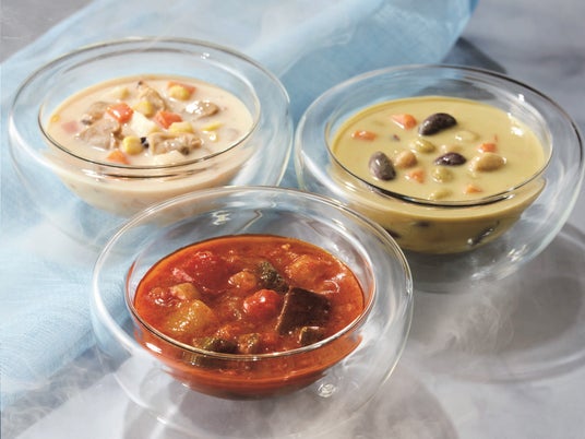 たっぷり入った具材が魅力の“食べる冷製スープ”。夏野菜のミネストローネ、つぶつぶコーンのクラムチャウダー、4種の豆と豆乳のポタージュのセット。素材や塩加減にも工夫をこらして仕上げました。