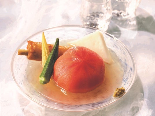 ほど良くだしを染みこませた、見た目も鮮やかな冷製おでん。水を極力与えない農法で育てたファーストトマトを中心に、はんぺんやオクラなどのおでん種を冷製用にアレンジしました。