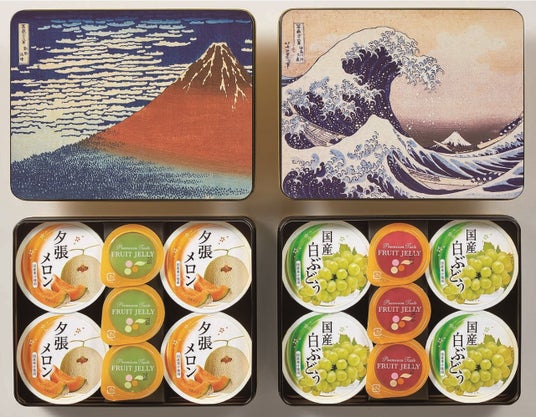 葛飾北斎の冨嶽三十六景を代表する2作品をあしらったギフト。富士山をモチーフに動と静を見事に描きあげた本作品は海外からの人気も高く、もらった方にきっと喜ばれる一品です。夕張メロンやあまおう苺など、国産の果汁を使用したみずみずしい食感のゼリーを映える缶に詰合せました。
