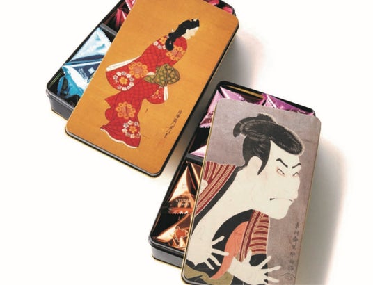 人気の歌舞伎役者や、時代のトレンドを感じさせる女性が描かれている浮世絵。当時の文化や流行をうかがい知れる作品が描かれた缶に、牛たんやチーズ、めんたいこやもんじゃ焼きなど、バラエティー豊かな4種の風味の柿の種を詰め合わせました。食べきりサイズの三角パックでお届けします。