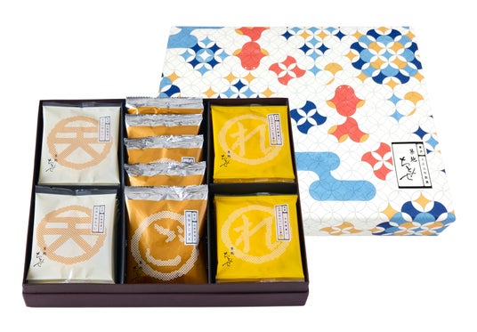 季節限定味の「天ぷらせんべい れもん塩」と共に、定番人気の「天ぷらせんべい」や「泥付きごぼう天せんべい」を楽しめる詰合せもございます。お土産やギフトにオススメです。