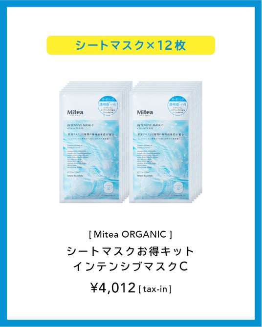 透明感*1とハリを与える「植物性持続型ビタミンC*2」配合のシートマスク。週2~3回の使用でより効果を感じられるので、12枚入りのキットで1カ月じっくりとご使用いただくのがおすすめです。