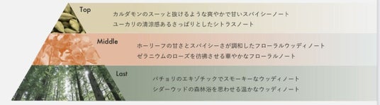 時間が経つと、ホーリーフやゼラニウムの柔らかなグリーンノートが広がり、徐々に心と身体がゆるんでいく感覚に包まれます。ラストには木の香りの深みが現れ、まるで森林浴をした後のような静けさと穏やかな余韻が残ります。