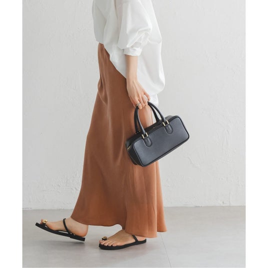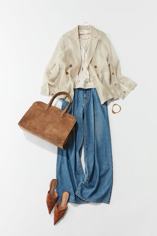 カジュアルなお仕事服をイメージ。デニムがカジュアルなアイテムのため、シアージャケットの中はツヤ感のあるブラウスを合わせています。深めのネックラインで肌を見せてあげることで、カジュアル過ぎず女っぽい。このバッグのようなスエード小物は夏のスタイルにおすすめで、夏素材は軽いものが多く、甘いスタイルのときにこの重厚感がアクセントになるので、持っていると重宝すると思います。