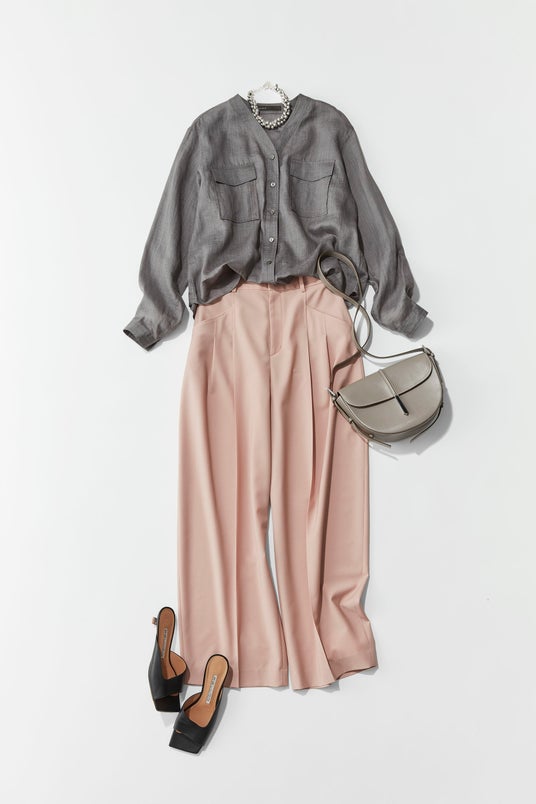 パンツの形が珍しく、着ると程よい丸みが出て女性らしい。リネンシャツも襟がなく、Vネックなのもいいですね。襟があるとメンズっぽくなるところを、深すぎず浅すぎないVラインなので、女っぽさが際立ちます。どちらも夏の肌が映えそうなスモーキーな色なので、首元にはシルバーアクセサリーを。お仕事でもおすすめのスタイリングです。