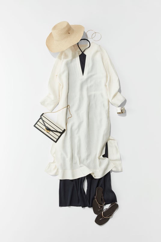 カフタンドレスの中に着こなしのテクニックを入れたスタイリング。襟の開いた肌見せは、黒を入れるだけで肌の露出度が気にならない。カフタンドレスの白にはオレンジなど明るい色も可愛いのですが、そうすると海やリゾートが似合うスタイルになるため、街で着る場合は黒で締めてシックな印象に。ハットやバッグで夏らしさを取り入れると、更にこなれ感が演出できます。