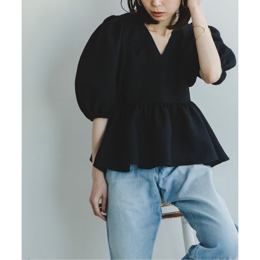 パフスリーブのブラウスは、シルエットの可愛さがありつつ、丈が長すぎないからそこまでボリューム感も感じず、さらにVネックだからシャープさもあるところが良いですね。ボリュームがあるトップスにタイトなパンツではなく、あえてゆったりとしたパンツを合わせながら、足元を華奢に女っぽい要素を。甘辛なバランスが好みです。