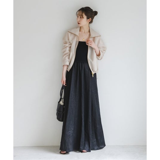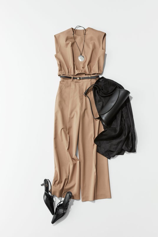 ワンピース並に活躍する時短コーデ。ノースリーブだけど少し肩にかかるから、お休みの日のおでかけだけでなく、オフィスのような「ON」のシーンでも着られるからいいですね。キャメルと白、ネイビーの色展開もベーシックで着やすいし、皺にならない素材なのもうれしい。シアージャケットと小物はブラックで引き締めて都会的な印象に。