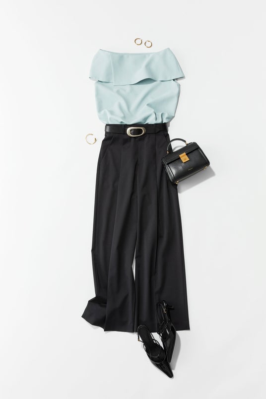 オフショルのようなデコルテ見せブラウスは、他のアイテムをダークトーンで重さを出しながら、スカートではなくパンツ合わせにすることで、肌見せ感がお仕事でも気にならない。ブラウス1点だけに女っぽさを際立たせて、他はハンサムな要素をもってくる。甘いアイテムをセンス良く着こなすことで、それだけで今っぽく、知的さも感じられるスタイルに仕上がります。