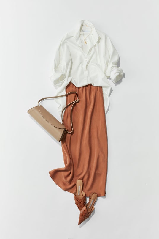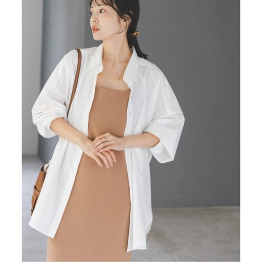 みんな大好きなビックシャツにナロースカートのスタイリング。キャミソールでもなく、タンクトップでもない、アメスリニットを襟元に入れるだけでビックシャツの着こなしが今っぽく、レイヤードを楽しむようなコーディネートに。スカートの色も素敵ですよね。濃すぎず浅すぎず絶妙なテラコッタカラーが、白シャツをぼんやりさせず、メリハリのある着こなしが完成します。