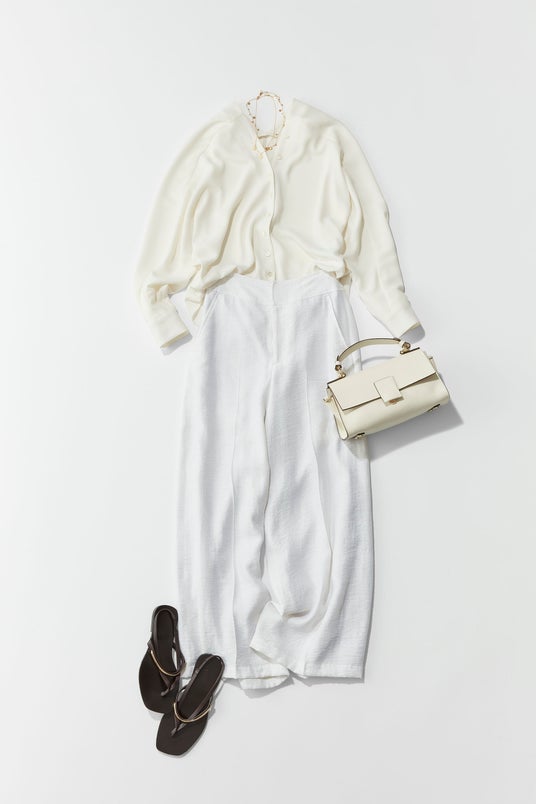 オールホワイトのスタイリング。オールホワイトは黒よりも迫力が出てしまうので、素材感が違うものを合わせて柔らかさを出しています。夏だからこそ素材がいろいろ選べるからいいですよね。ブラウスは皺にならない素材で、Vネックのほどよい肌見せも魅力。ワイドパンツも素材に表情があるから、クリーンでいてさりげないルーズさが、洗練された大人の抜け感を表現してくれます。