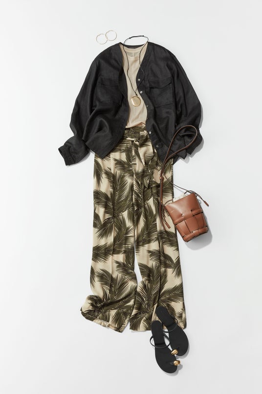 デイリーに使えるプリントパンツを、バケーション的なコーディネート。大きい柄のパンツは一見派手に見えるから、色味を抑えることが大事な気がしていて。プリントのベースカラーに合わせて、トップスもベージュで繋げてあげると、スタイリングがよりまとまります。シルバーよりも、ゴールドのアクセサリーやサンダルにすると、カジュアルな装いの時ほどリッチな印象に仕上がります。