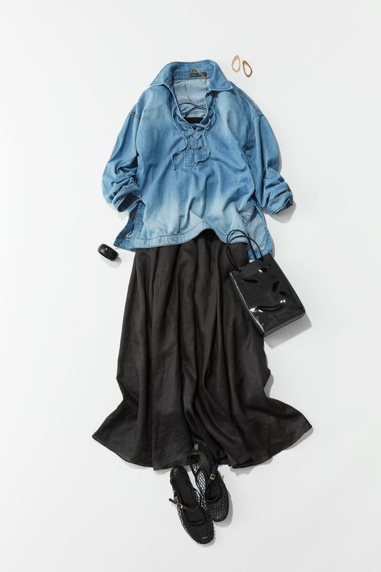 シックな黒のベアワンピに、デニムシャツを合わせる休日スタイル。休日でもフルレングスでボリュームのある黒のワンピースなら大人っぽい品格に。かぶりのデニムシャツで今っぽく、黒小物まとめて、ジュエリーはゴールドを。カジュアルとエレガントの両軸のバランスが調和するよう、意識しています。