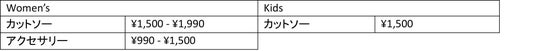 商品ラインナップ: ウィメンズ4アイテム、キッズ1アイテム、アクセサリー2アイテム