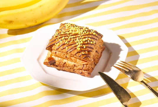 729層に重なったサクサクパイ生地の中にバナナの果肉が入ったバナナカスタードクリームをたっぷりと注入。その中に、食感も楽しめる棒状の「バトンショコラ」を1本贅沢に差し込みました。天面には線がけチョコとバタークランチをトッピング。チョコとバナナを掛け合わせた、どこか懐かしい風味をお楽しみください。
