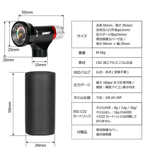 全長55mm、高さ35mm/空気注入口外径φ12mm/圧力ゲージ径φ25mm/発泡保護カバー寸法/長さ59mm × 幅29mm