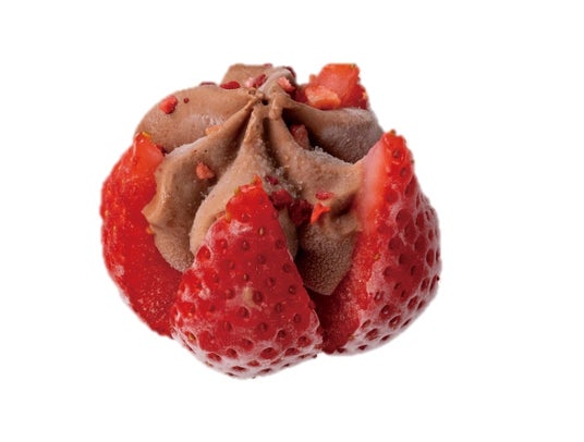 お花のように咲いたあまおう苺にチョコレートアイスを絞った華やかなアイスデザートです。フリーズドライの苺をトッピングし、ほろ苦いチョコレートアイスと苺の酸味が絶妙な、見た目も味わいも楽しめるひと口アイスです。
