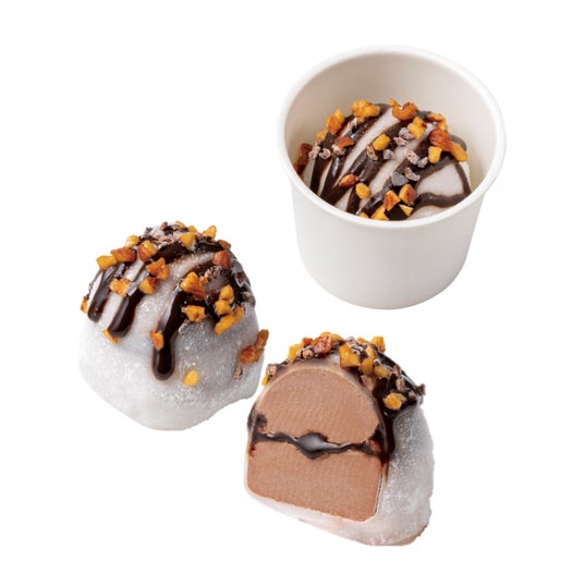 濃厚なチョコレートアイスクリームに、オリジナルのチョコソースを忍ばせ、柔らかな求肥で包みました。香ばしいアーモンドとカカオニブ、チョコソースをトッピングし、食感と風味のアクセントをプラスしています。もちもちの求肥となめらかなアイス、とろけるチョコソースが織りなす贅沢な味わいです。